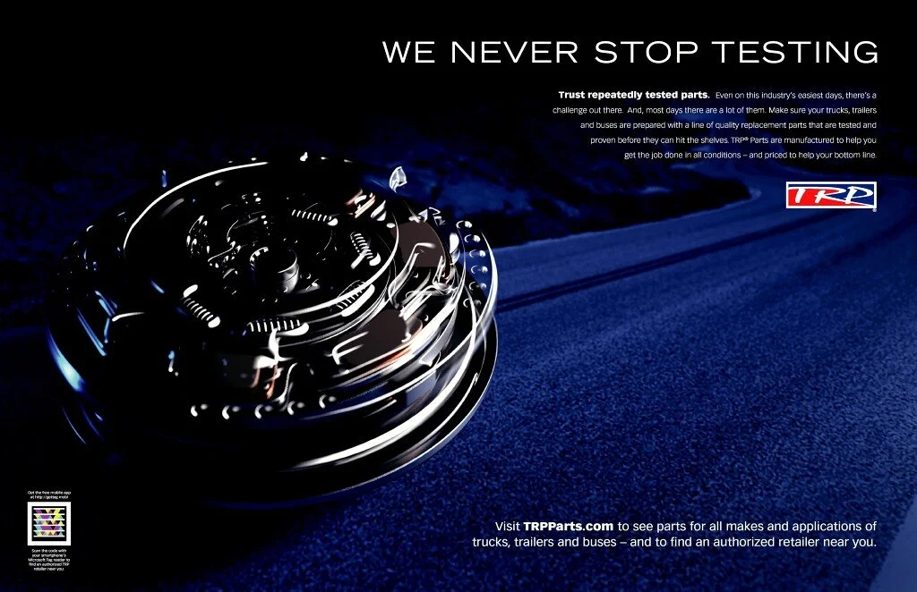 I worked on the PACCAR (Peterbilt & Kenworth trucks) account at FCB for nearly six years. During that time, the client merged all of their parts brands under the TRP name. We were tasked with soft launching the new brand in retail and these print ads. Unlike other truck part ads, our TRP work had an elegant look and aspirational tone that fit with PACCAR's identity. They really stood out in industry publications.